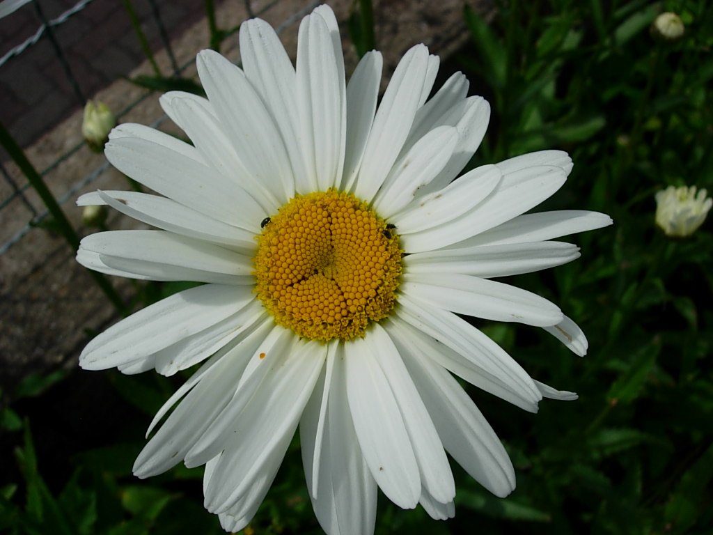Pour la 1ère, je ne suis pas sûr, il y a plusieurs sortes de marguerites de même couleur, mais si les tiennes sont assez grandes, alors il peut, tout simplement, s'agir de la Grande marguerite, Leucantheme, Marguerite d'été (Nom latin: Leucanthemum x superbum syn. Chrysanthemum maximum)