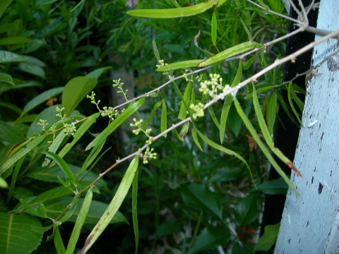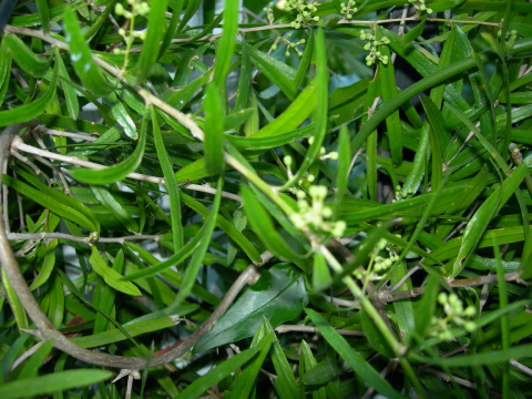 cette plante verte épineuse prolifère en extérieur elle fait des grappes de petites fleurs blanches en été qui se transforme en petite baie qui deviennent rouges en hiver.