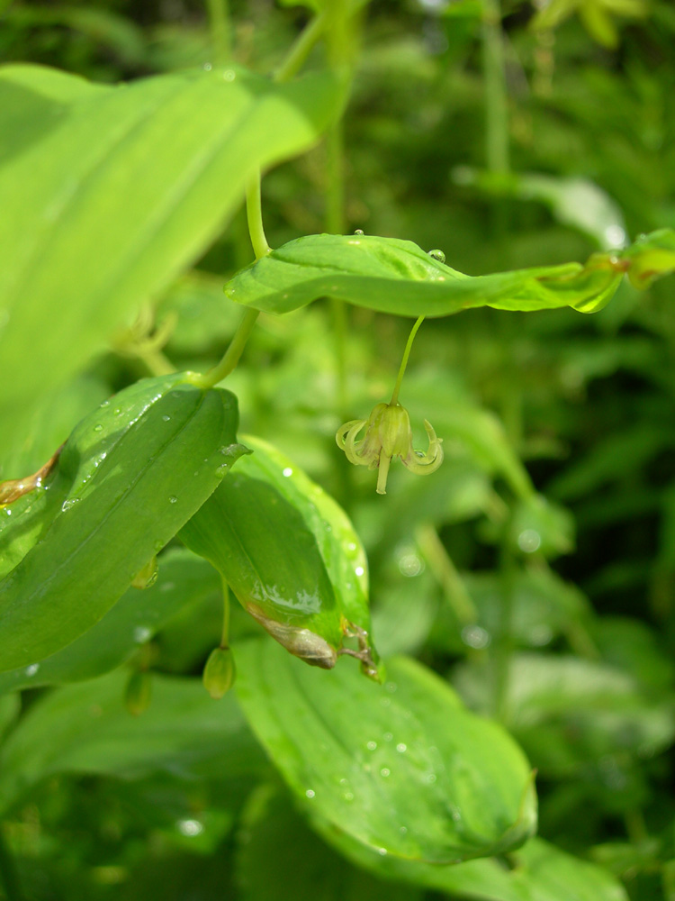 cette petite plante est une Uvulaire : streptopus amplexifolius;Liliacée proche des sceaux de salomon, on la trouve parfois jusqu'à 2000 m d'altitude!!! je ne connais pas son statut ds les Vosges, protégée ou pas.. on la trouve ds les Alpes , en Suisse et ds le nord de l'europe...
