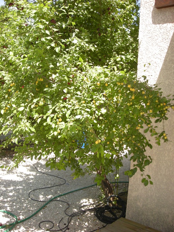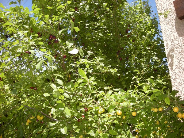 Bonjour, j'ai cet arbre qui depuis 3/ 4 ans me donne des fruits, de 2 variétés de prunes (les troncs sont entrelacés, a ne faire qu'un), et cela seul car je n'ai jamais planté quoi que se soit à cet endroit. Voici des photos