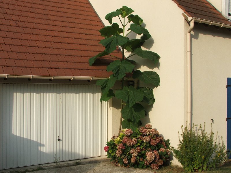 En rabattant tous les ans le jeune sujet planté, il se maintient sur des tiges de 2.50/3m et des feuilles de + de 50 cm de large en effet. (prévoir un trou de plantation adapté à ce grand arbre genre 1m3)... Bonjour de la Bretagne..