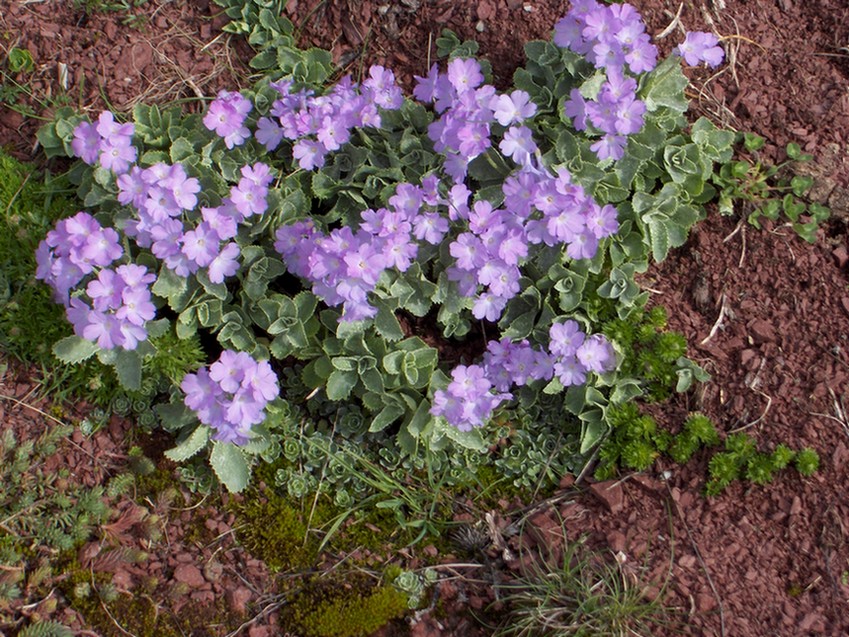 La couleur de Primula allionii n est pas uniquement rose elle peut varier du blanc rosé au mauve...difficile de dire sur la photo que les fleurs sont solitaire ou pas..si plusieurs axes floraux se rejoignent cela forme une masse...sinon le feuillage correspond et ne correspond de toute façon pas à viscosa
