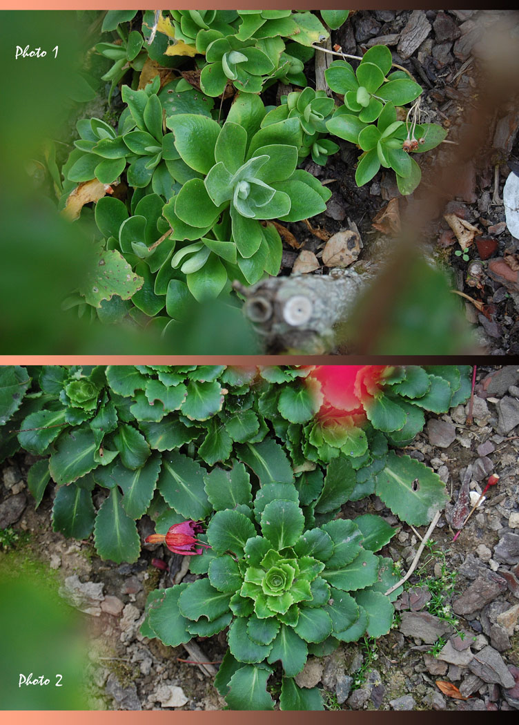 Me promenant dans les magnifiques contrées du centre Bretagne (loin des algues vertes) et de-ci, de-là, papotant avec les riverains, je suis tombé sur ces deux petites plantes qui ronflaient sous des rosiers et des fuchsias. La gentille petite dame qui les hébergeait, ne connaissait pas leurs états civils. Après avoir discutaillés de bon cœur, elle m’a confié que celle figurant sur la photo 1, plante grasse, donnait des fleurs ressemblant à des primevères.