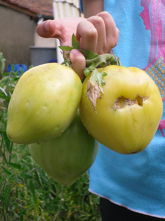 pour exemple, mes coeurs de boeufs blancs 2009 , ici, qui font bon poids, leur "maman" et "papa" ( puisque la tomate se fertilise seule)ne faisait pas le quart de leur taille!