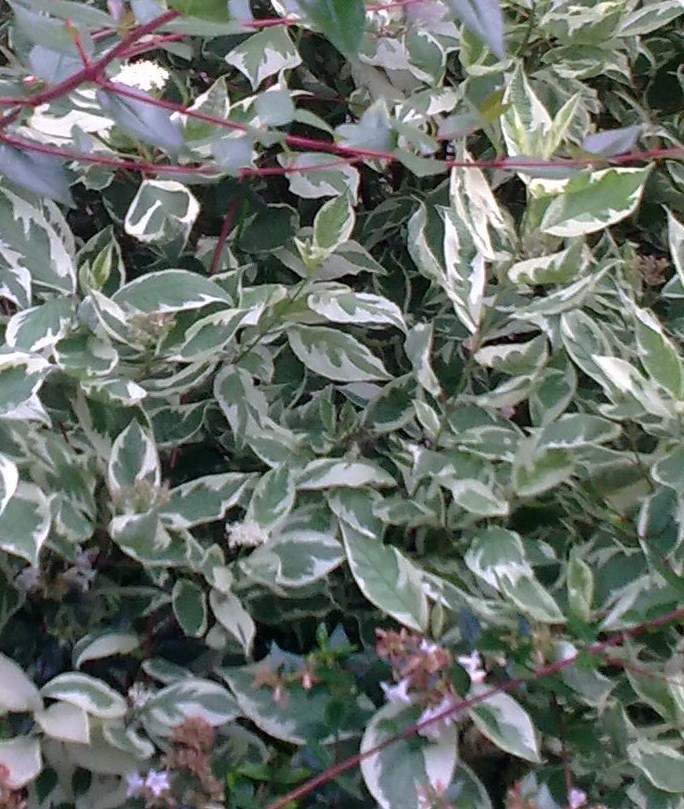 Probablement un Cornouiller panaché blanc Cornus alba 'Elegantissima'.