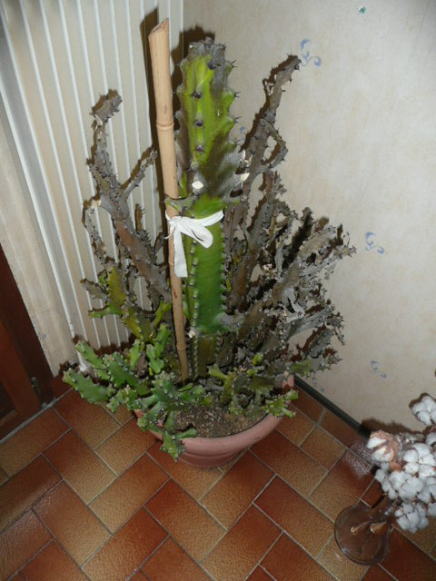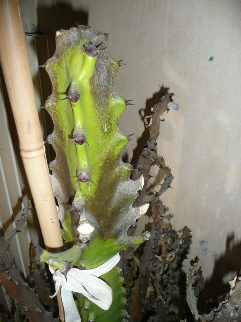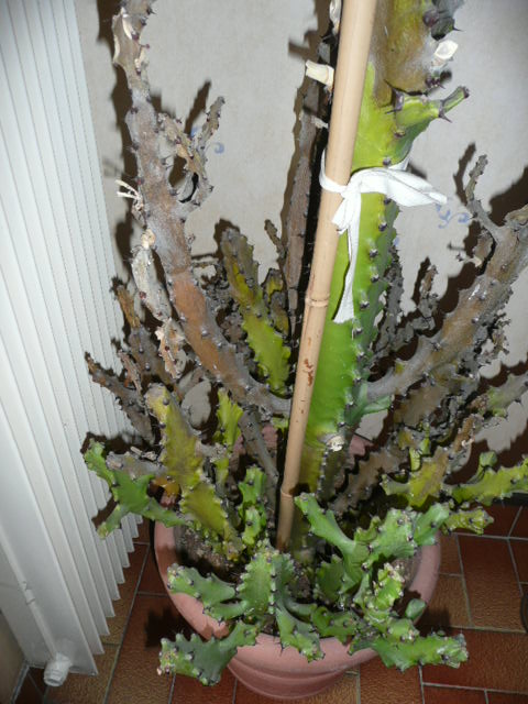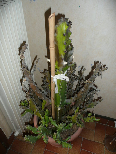 d'abord identifier la plante: c'est une euphorbe ( pas une cactée)type arborescente.. ces plantes sont trés sensible à la pourriture... un arrosage de trop et ....ou une atmosphére trop humide...