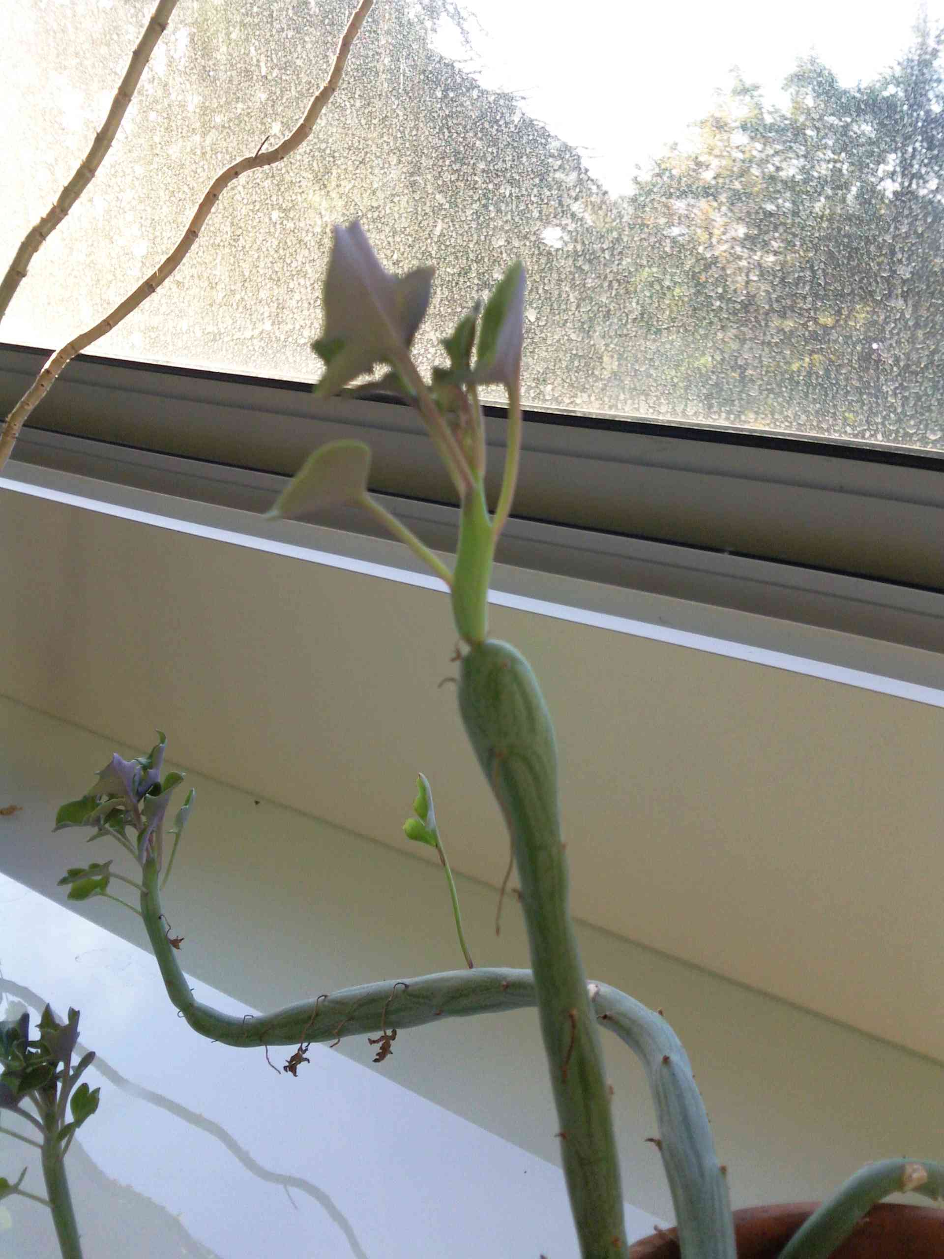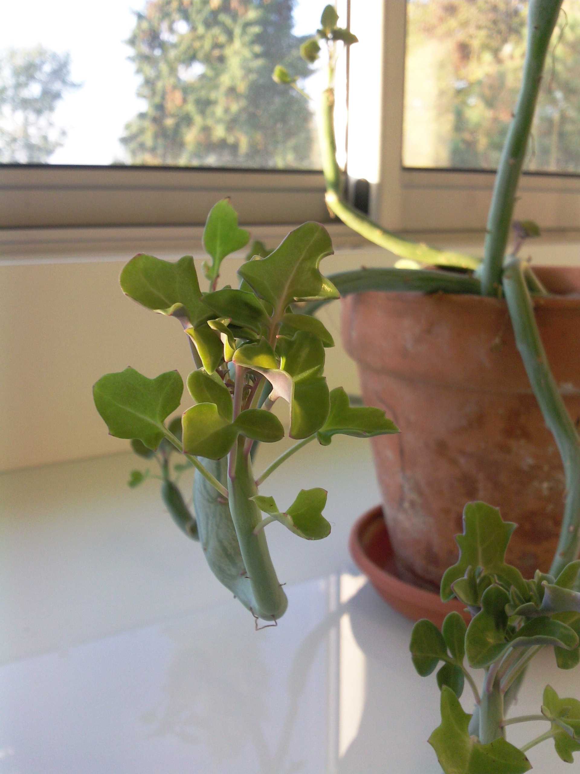 j'aimerais identifier une plante grasse qu'il y a dans mon labo de svt. C'est une sorte de plante "cornichon": quand on l'arrose régulièrement, elle développe des feuilles, sinon, elle produit des tiges photosynthétiques charnues en forme... de cornichon!