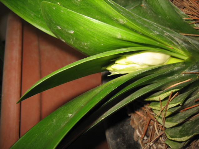 le clivia ici dans la serre fait des bourgeons qui commencent à sortir. On va reprendre les arrosage avec engrais dans une semaine à peu près.