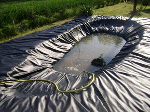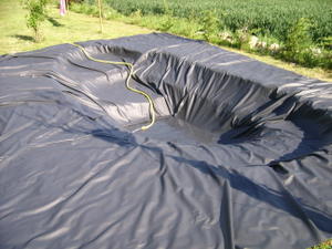Une fois celle-ci achetée, nous la déplions et l'installons dans ce trou (taille de la bâche 6m X 8m ) éh oui ça fait un bon bout !