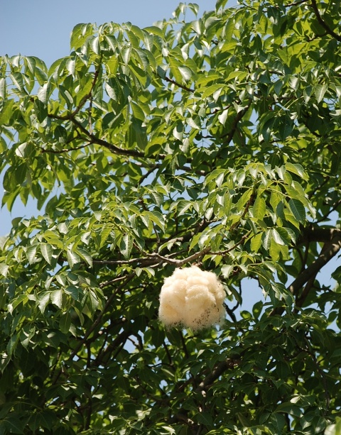 Les fleurs ressemblent à de grosses boules de coton, à moins qu'il s'agisse du "fruit" de cet arbre.