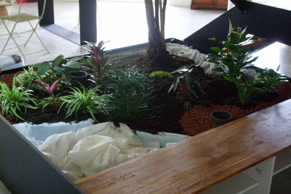 Sur celle ci, on voit les 2 tubes PVC de diamétre 120mm, un sert de regard pour vérifier que le ficus n'a pas était trop arrosé, l'autre sert à remplir la réserve d'eau placée sous les plantes vertes. J'ai mis 70 litres mais ça peut contenir au moins 100 litres.