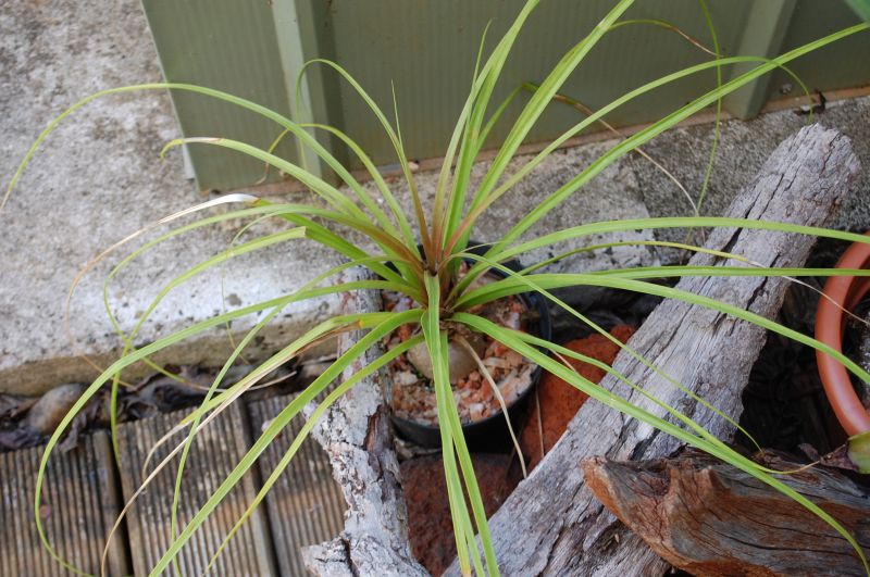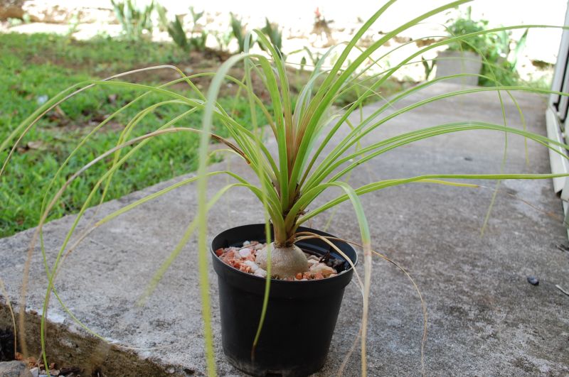 c'est bien un beaucarnéa,, ça vit tout seul je ne m'en occupe pas du tout de l'arrosage quand j'y pense mais il vit très bien sans , une jardinaute m'en avais apporté un petit petit et je l'ai comme le tien par contre je le rempote chaque année juste une taille de pot au-dessus après l'hiver le tien a un peu souffert les feuilles abimées tu les coupe tout simplement