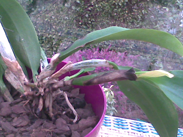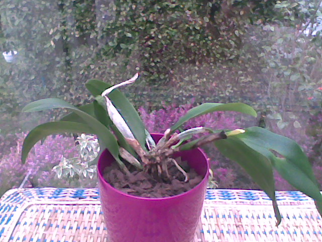 Voici une orchi que j'ai récupéré, mais sans identification, il parait qu'elle avait des fleurs rouges, mais c'est peu pour l'identifier et encore, c'est sous réserve. Grâce à Tite Nabou, depuis j'ai changé la terre, remplacée par mélange 'Terreau de France' spécial orchidées et billes d'argile.