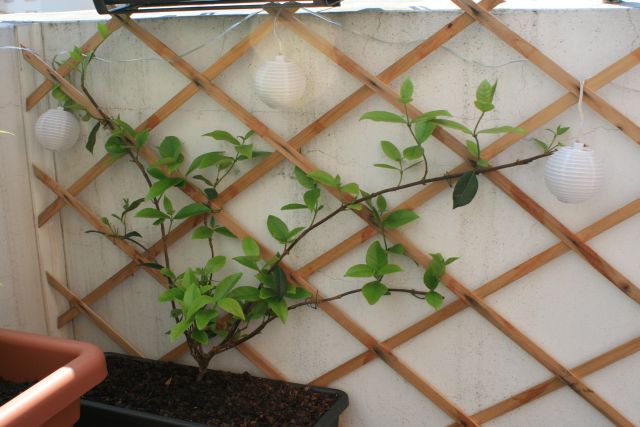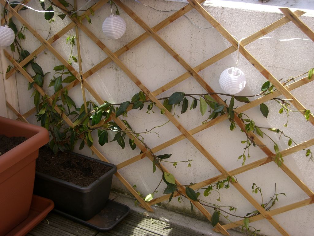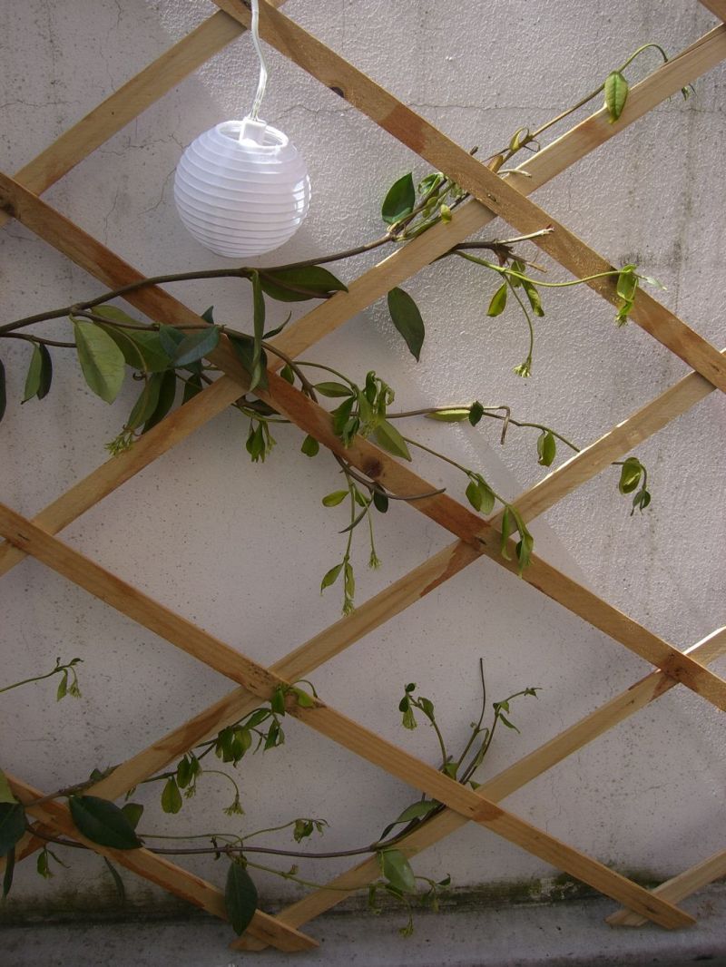 Je crains l'avoir trop brusqué en l'entortillant autour de la treille donc je viens de le défaire délicatement et d'attacher juste qqes branches avec du fil...