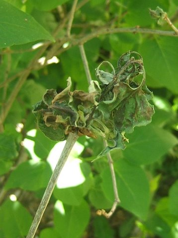 j'ai un lilas dans le jardin qui va de plus en plus mal : ses feuilles brunissent et se fripent et la branche meure ensuite. Ça a commencé l'année dernière assez doucement, mais cette année, ça a recommencé de plus belle !