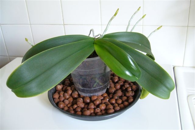 Depuis le rempotage je l'ai changée d'endroit mis le pot sur une couche de billes d'argile avec un peu d'eau au fond de la soucoupe sans toucher le pot