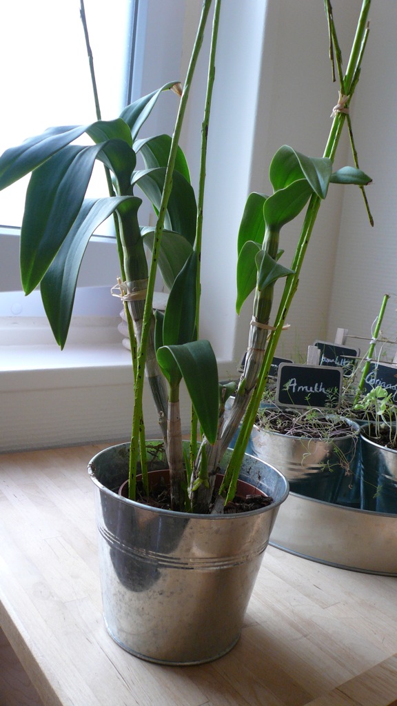 aprés j'ai mis les conseils en application j'ai eu du mal à lui trouver un endroit où elle se plaise car ses feuilles tombées une à une et elle n'était plus aussi jolie état mais depuis qu'elle est dans ma cuisine elle reprend du poil de la bête(on m'avait dit que ces hampes se flétrirait mais rien de tout ça). sinon elle est dans son pot d'origine je la vaporise tous les jours et le we une fois sur deux je la baigne dans un engrais pour orchidée (orchid focus grow). voila tt se que je peux vous dire.