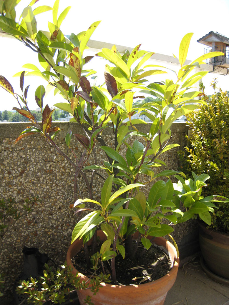 Ce laurier est sur une terrasse orientée sud / sud est, cela fait 5 ans que nous l'avons ; il n'a jamais été très en forme mais c'est la première fois qu'il fait ça. Je l'avais traité l'année dernière avec de la bouillie bordelaise car les feuilles avaient tendance à jaunir. Peut être faudrait-il le rempoter avec du bon terreau ?
