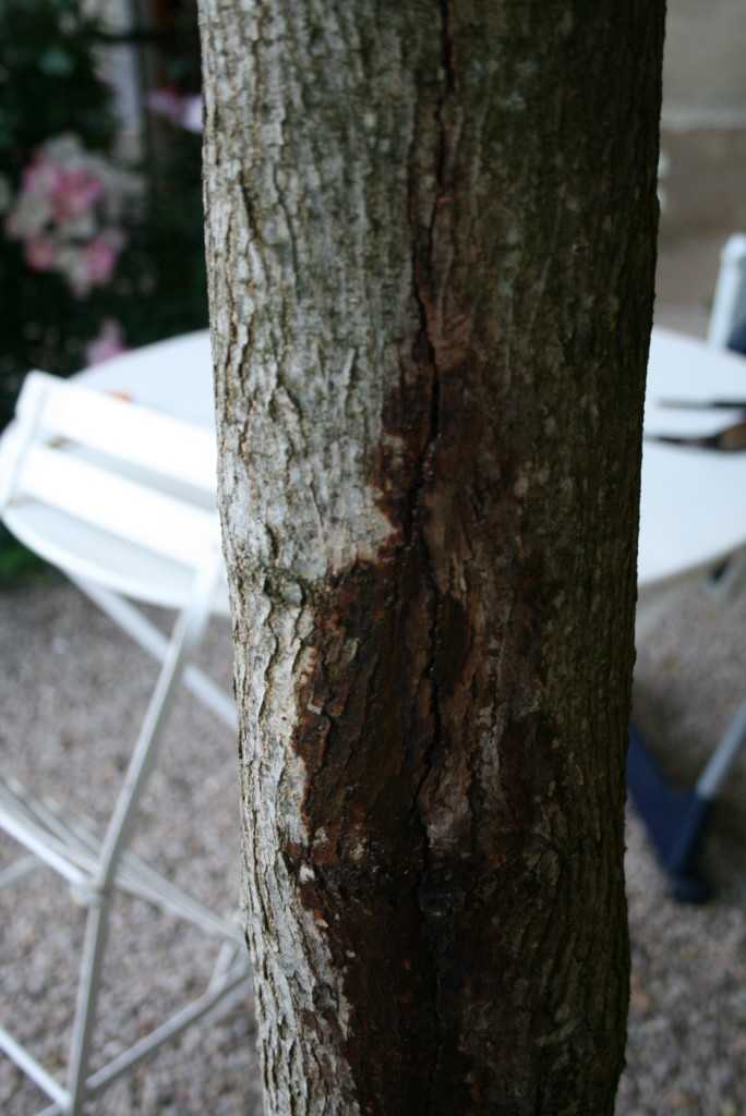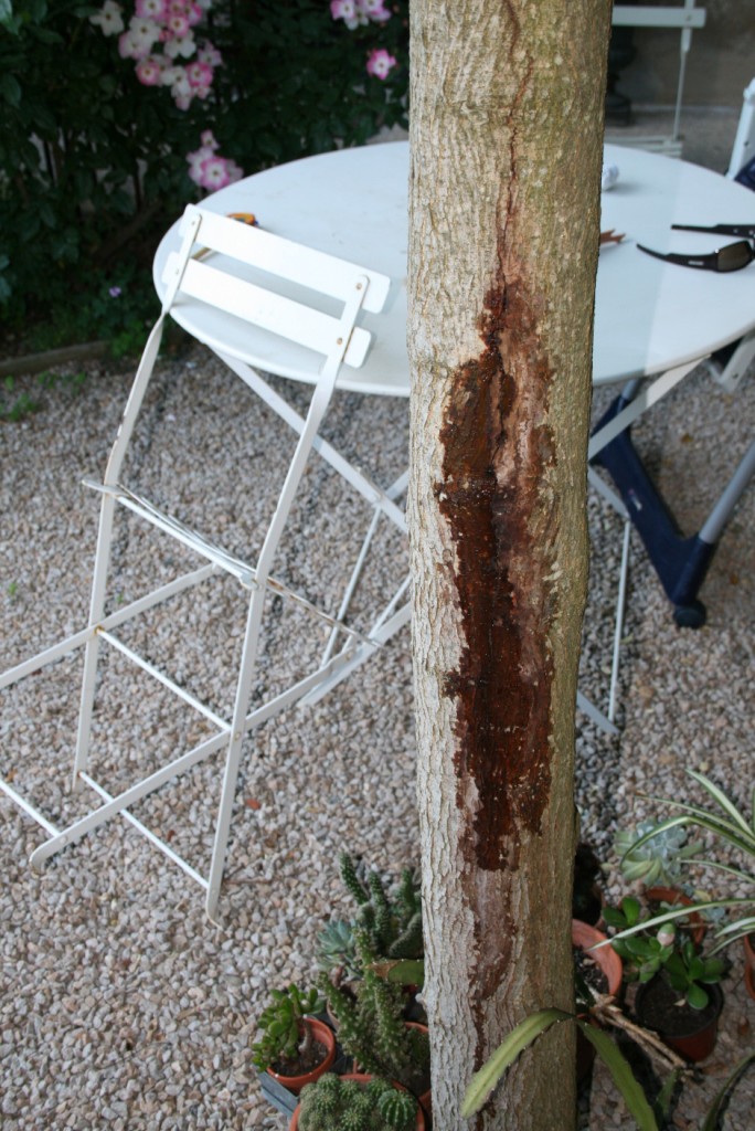 Ce murier platane présente, sur le tronc, une tâche brune humide (mais non collante) provoquée par un suintement. Apparition récente. Pas de signe suspect sur les branches ou sur les feuilles qui ne tombent pas. merci de vos réponses