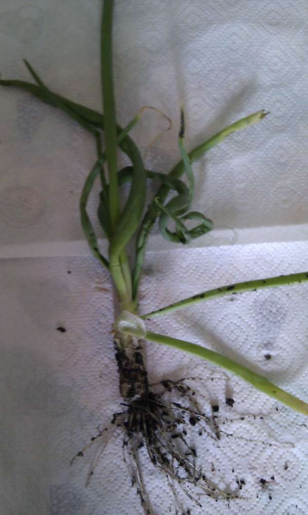 Ca me semble caracteristique de la mouche de l'oignon. Elles pondent au niveau du bulbe, les asticots creusent dans ce bulbe vers le sol et puis en sortent pour se nymphoser dans la terre. Quand tu vois tes oignons tordus au niveau de la base tu verras peut-etre encore la larve blanche ou nymphosee en marron ou rien car deja dans la terre !