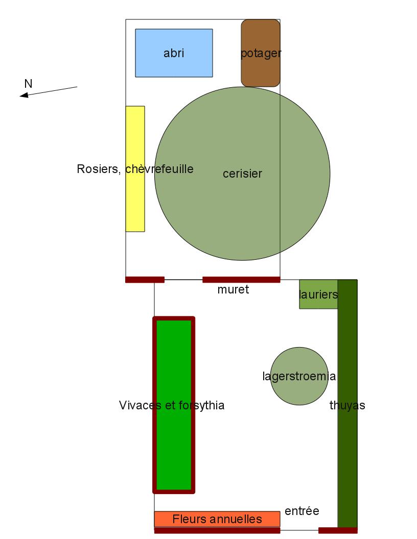 J'ai un petit jardin, orienté Est-Ouest, et suite à différents événements (ajout d'une clôture par le voisin du sud, maladie d'un cerisier), je pense à le réaménager.