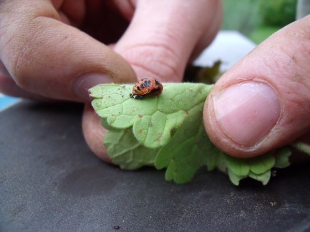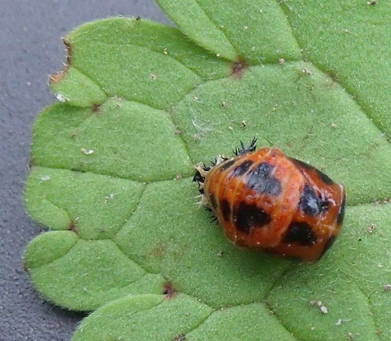 Dans mon jardin, à plusieurs endroits, j'ai trouvé cet insecte, qui ressemble un peu à une coccinelle mais avec des pattes qui s'agrippent aux feuilles.