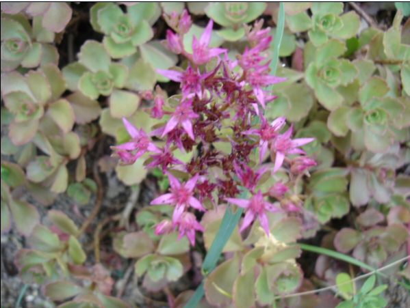 Dans le jardin pousse cette petite plante succulente de dix centimètres de haut, tapissante, qui fait des fleurs roses début juillet.