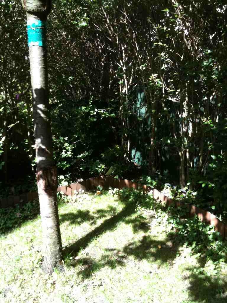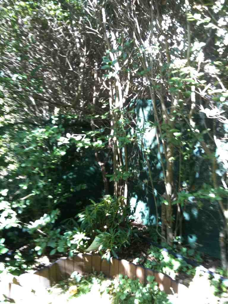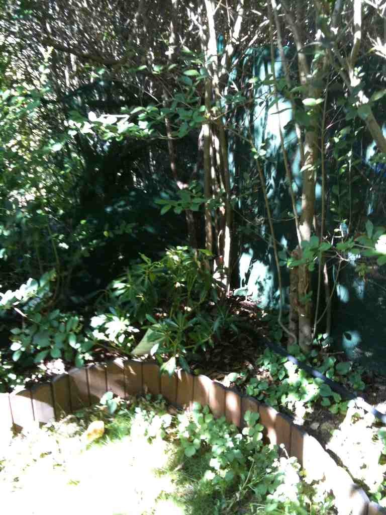 C'est une zone en angle où pousse pour l'instant un reste de haie de troène car il y a un cerisier qui fait pas mal d'ombre même si l'été en fin de journée vers 16 h le soleil arrive mais en faible quantité.