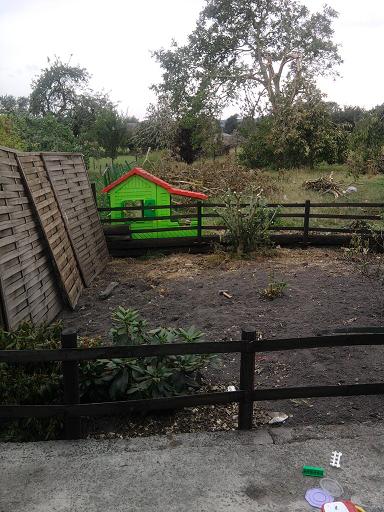 en fait l'extérieur est forme en rectangle de 2 fois 10 ares sur les photos c'est le parterre qui se trouve en rectangle 1 le passage vers la pelouse est au départ de la terrasse et contourne la future pelouse et le future bassin en rectangle 2 on a le potager de 100m2 a cote l'allée de fruitier et tout au fond nous avons un enclos avec quelques poules se que je dois combler ce sont les photos donc le parterre il est entièrement clôturé et est a raz de ma terrasse