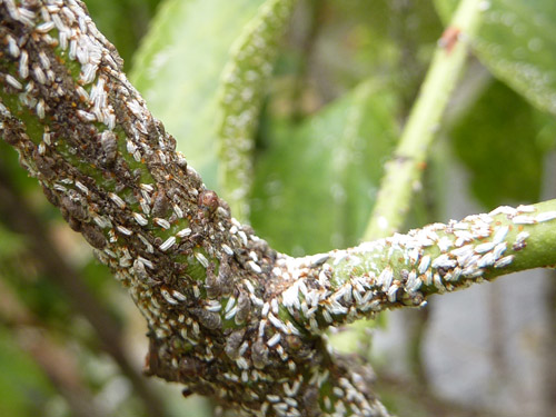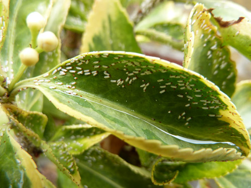 De retour de congés estivaux, je découvre avec horreur qu'un parasite pullule sur les branches et feuilles de quelques unes des espèces du jardin. Ce parasite ne semble s'être attaqué qu'à un buis panaché ainsi qu'aux troènes classiques et panachés.