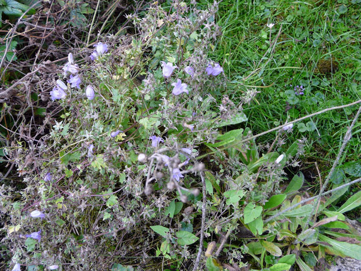 je joins deux photos de la campanule qui s'étale dans ma rocaille. Les fleurs sont superbes en début de saison. Les tiges font environ 60 cm. Qui peut m'indiquer son nom exact ?