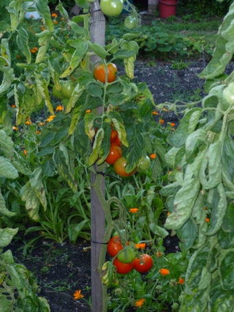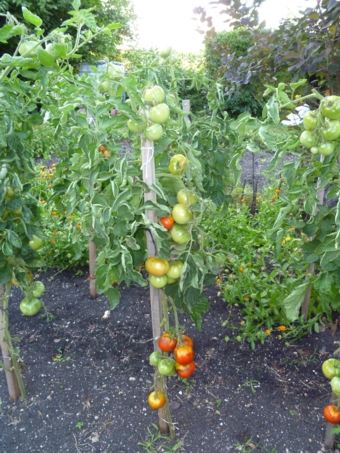 attention il me semble que tes plants de tomates ont le mildiou !!!! (taches brun-noir de la pointe feuilles -> vers le centre) il te faut couper toutes les feuilles malades avant que des taches noires apparaissent sur les tiges ensuite les tomates seront aussi contaminées !! récolter tout ce qui est presque mùre pour finir en cagettes à l'ombre voir dans le noir (ça murit plus vite). Ce n'est plus la peine de traiter au sulfate de cuivre, une fois que la maladie est là, c'est trop tard.