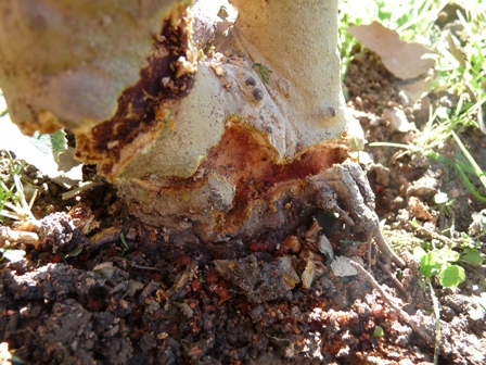Et ce matin, je découvre de la "sciure" rouge à son pied. Je gratte, et mets à jour un "tunnel" noirâtre qui ceinture le tronc, jusqu'aux racines...