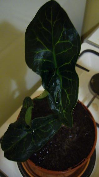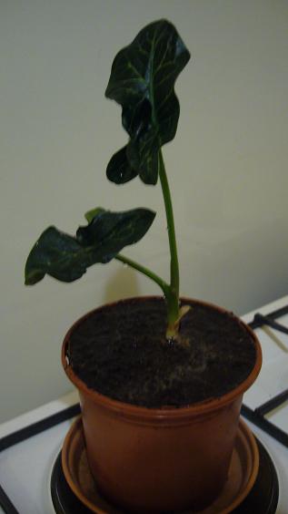 La plante me fait penser à un alocasia, si il y a une "patate" ronde..
