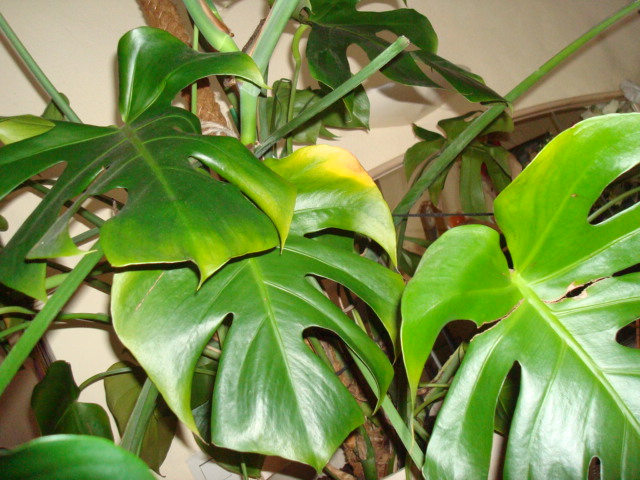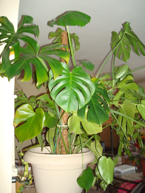 Il a de profondes découpes dans les feuilles entre les nervures (sauf celles qui poussent au début d'une nouvelle branche les petites) Comme allure il ressemble à celui de Marie-Hélène. C'est un Monstera, mais je ne connais pas son espèce, sans doute deliciosa la plus courante. Il aime être au soleil, chaque feuille a une zone sur le pétiole, juste avant que ne démarre la feuille, qui peut se tourner vers le soleil.
