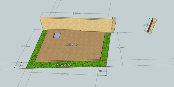 D'abord, je dessinerais le potager : j'imagine que tu as prévu des passages dans ces 16m²? (2 rectangles, un passage au milieu? 4 carrés, 4 chemins en croix?, etc...)