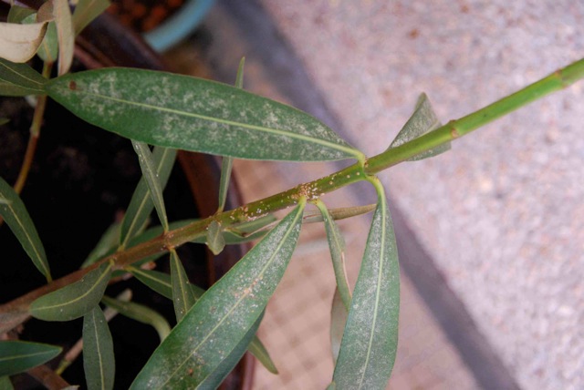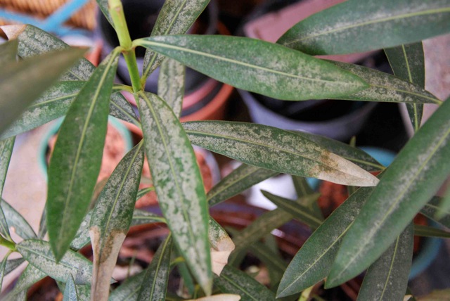 Il est attaqué de tâches blanches sur les feuilles, qqs feuilles sont comme brûlées à l'extrémité, qqs points blancs sur les branches aussi...