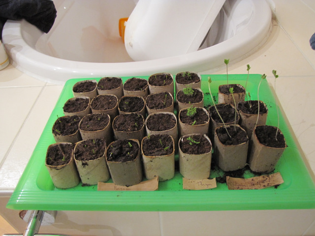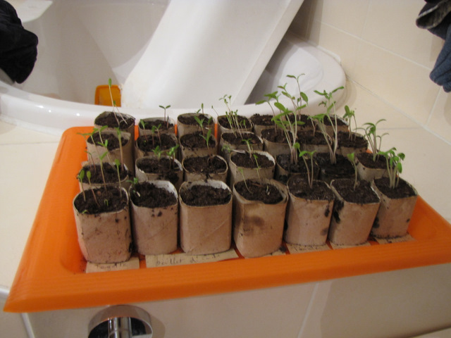J’ai d’abord repiqué mes tomates qui filaient, et j’ai eu la bonne surprise de voir que certaines avaient commencé leurs vraies feuilles (je désespérais de les voir je dois avouer) :