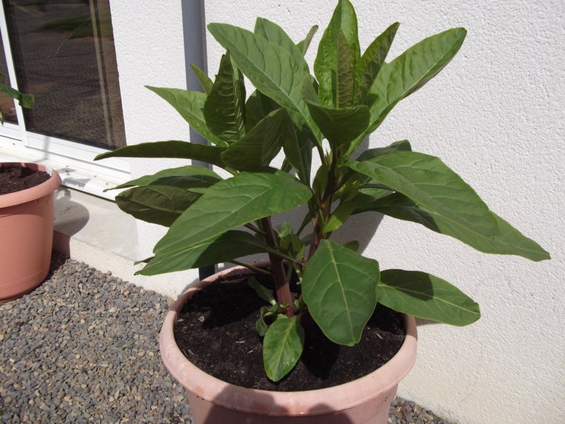 Je l'ai planté a la mi mars en pot, et aujourd'hui 12 Avril, voila a quoi il ressemble, la plante fait déja environ 50 cm de haut, avec 2 tiges principales d'une couleur plutot violette, et de belles feuilles d'environ 20 cm de longueur.