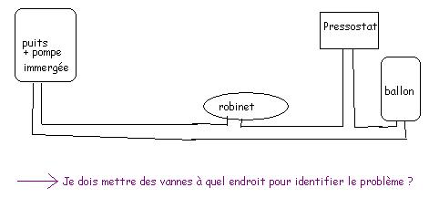 pour commencer, si il y avait une vanne avec purgeur orienté coté pompe et purgeur remplacé par un manomètre entre la pompe et le robinet, ça permettrait de fermer cette vanne, la partie de tuyau entre le robinet et le ballon serait sous pression avec le ballon ;