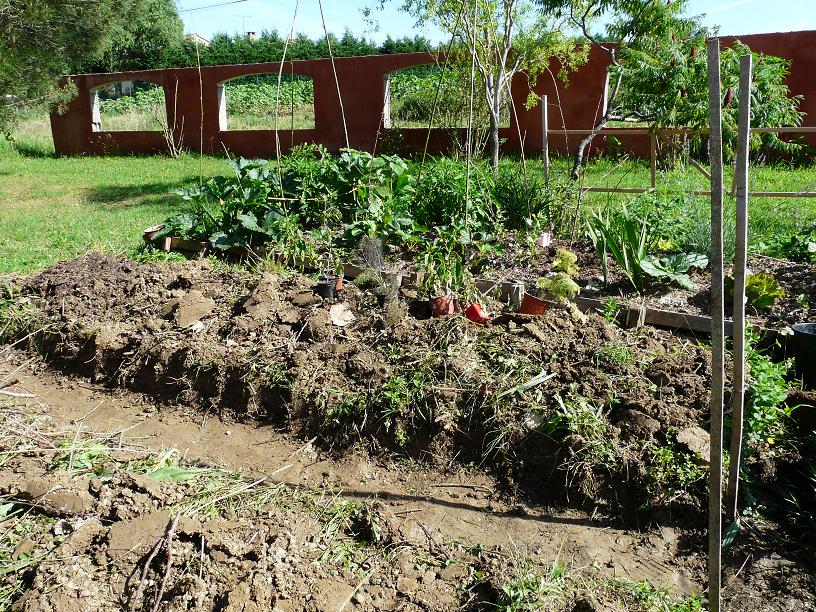 Aujourd'hui j'ai une butte de 1m20 de large et 8m de long. Sur une moitié j'ai mis du carton pour éviter le repousse des adventices et paillé avec de la tonte de pelouse et feuilles mortes, sur l'autre moitié, il y a la même chose sans carton. J'en ai fini une deuxième plus courte (environ 4 m) avec carton et paillis toujours de tonte et feuilles.