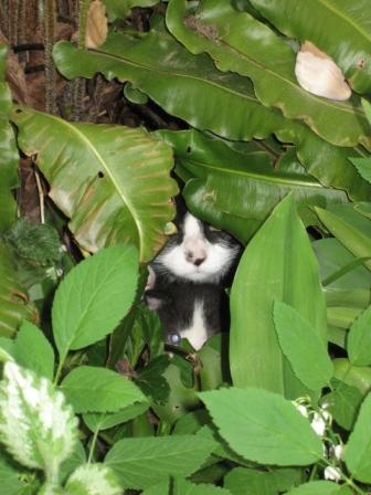 La semaine dernière (Pâques), j'ai eu la surprise de trouver dans mon jardin, bien cachés à l'abri d'une fougère, une chatte et ses 2 petits chatons.