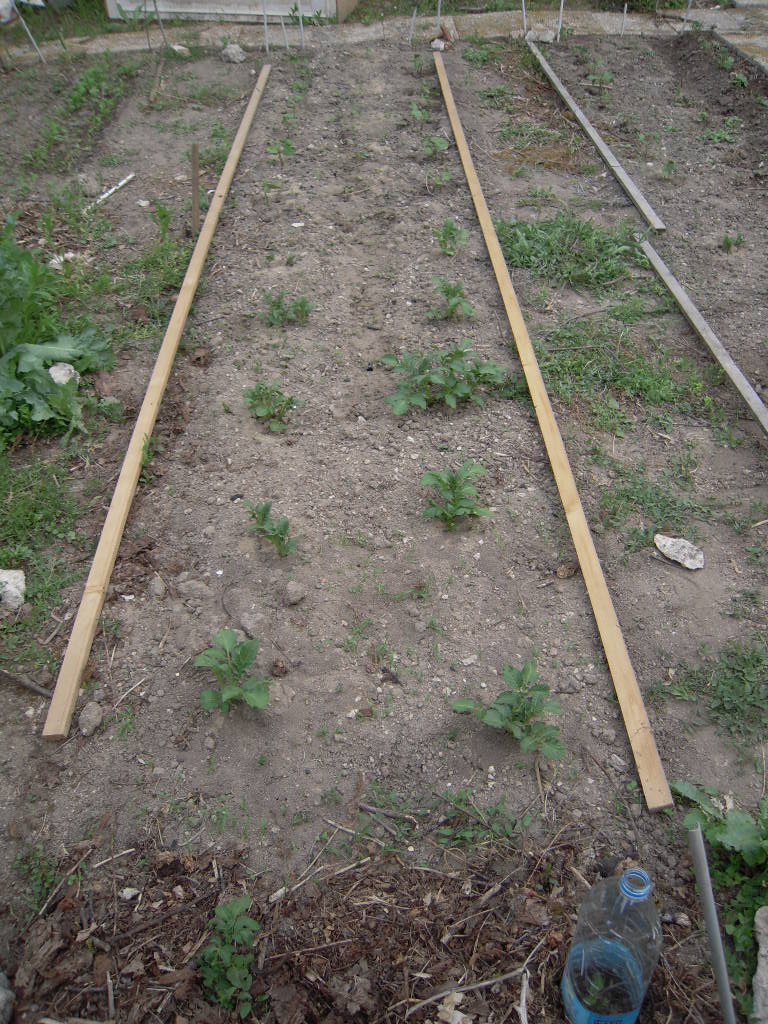 une planche de patates/haricots avant buttage la même après buttage une autre après buttage+paillage gros plan patate avant