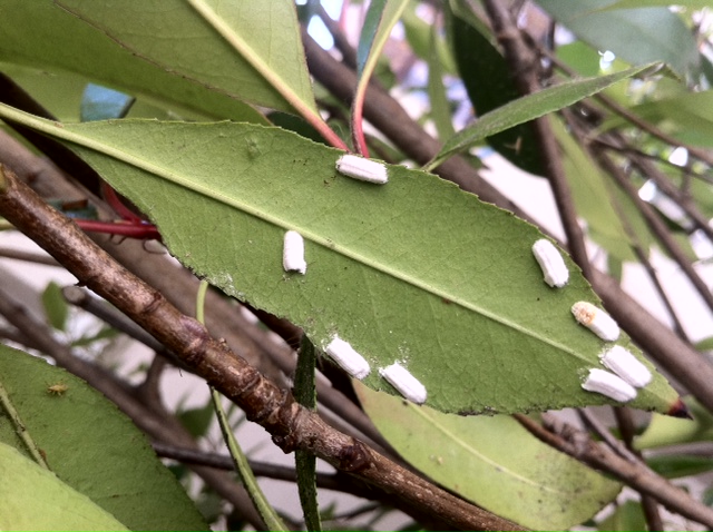que toutes les feuilles de mon photinia en pot avaient comme des cocons / nids blancs sous les feuilles (2a3 mm de large, un demi cm de long) voir photo