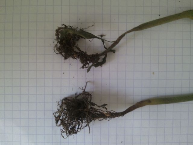 ..Suite et catastrophe ; je viens de déterrer 2 pieds qui semblaient aller bien mais qui grandissaient mal depuis ces derniers jours : ça ressemble bien à la pourriture grise : au niveau du collet il y a comme une bande brune avec ce qui ressemble à des petites plaies.