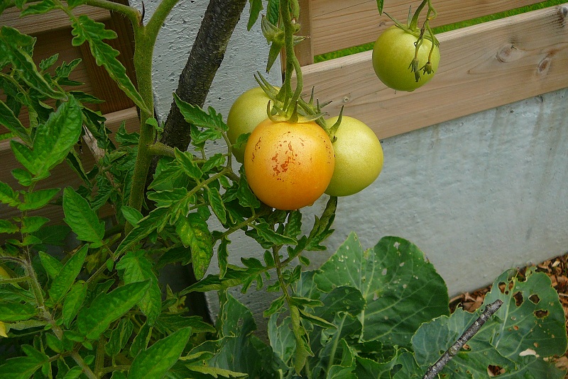 Étonnant que les feuilles soient intactes. Je pencherai pour "la nécrose apicale" ou plus communément appelé "cul noir". A voir avec les spécialistes de la tomates. Sinon, le choux à côté à été mangé. Attention à la piéride.