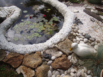 J'ai caché la bache avec des dalles de galets, les bords étant en béton arrondis, il était difficile de poser des pierres plates, bien sur si la bache perce je ne suis pas dans la cr... !!