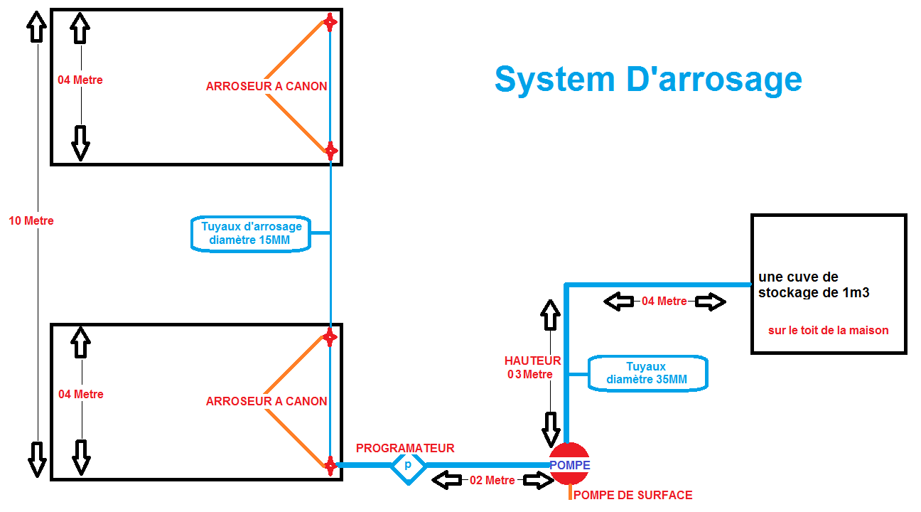 en plus la pompe ne fait pas d'effort pour aspirer l'eau il y a déjà de la pression juste pour le refoulement la distance entre pompe et premier arroseur et de 2m ensuite un décalage de 2.5m entre chaque arroseur