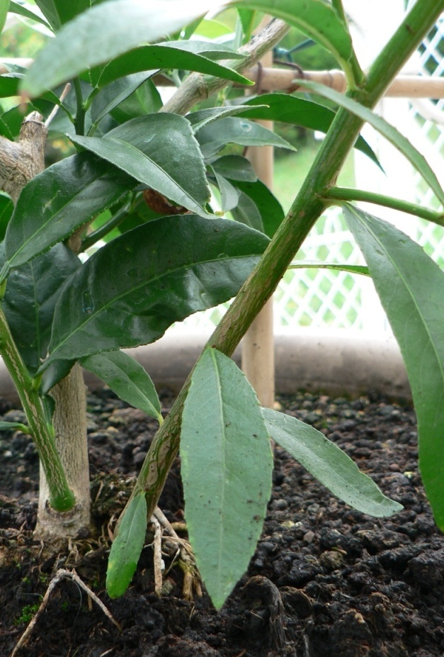 Une branche pousse dans le pot d'un citronnier. Je n'ai pas l'impression que ce soit le citronnier car les feuilles n'ont pas du tout la même odeur.