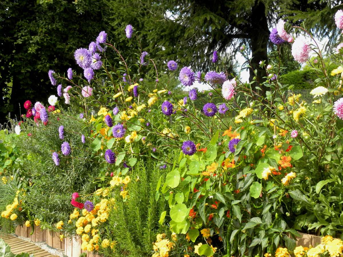 Le massif de fleurs et aromatiques est en pleine floraison.